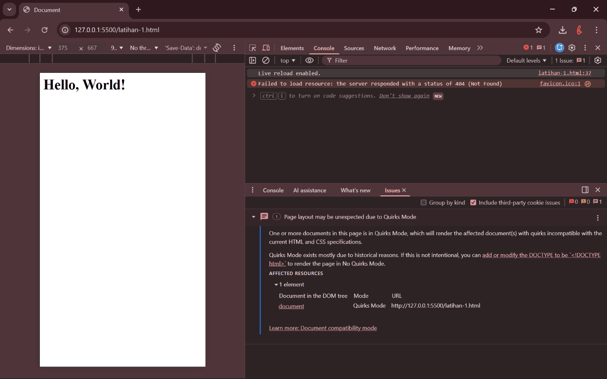 - Biasanya akan muncul info apakah halaman dalam Quirks Mode